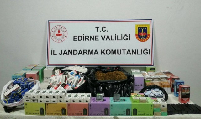 Edirne'de jandarma ekiplerinin düzenlediği kaçakçılık operasyonunda çok miktarda gümrük kaçağı tütün, elektronik sigara, makaron ele geçirildi, 2 şüpheli gözaltına alındı.