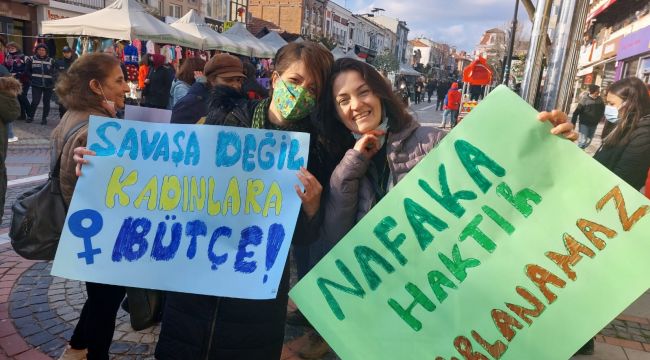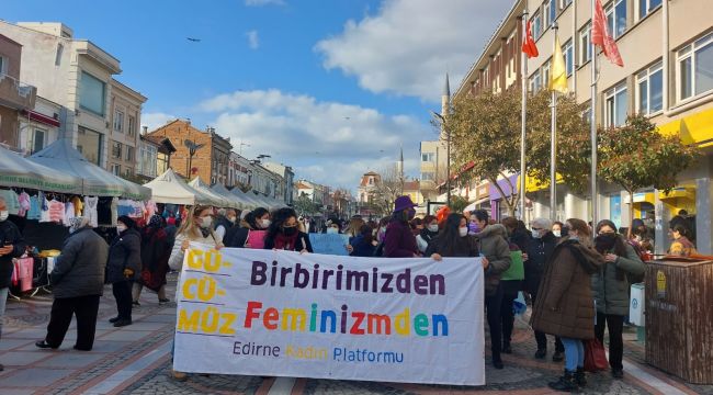 Edirne Kadın Platformu, 8 Mart Dünya Kadınlar Günü sebebiyle Saraçlar Caddesi'nde bir araya gelerek paltform adına basın açıklamasını Kezban Demir okudu. Türkiye Dünya'da kadın işsizlik oranının en yüksek olduğunu, kadın istihdamının en düşük olduğu ülkelerden birinin olduğunu belirten Demir, Kayıt dışı işlerde, güvencesiz ve düşük ücretlerle istihdam edildiklerini ifade etti. Ev ve bakım işlerini aksatmamaları için esnek çalışmanın olması gerektiğini belirten Demir, 8 Mart günü kadınların ücretli izinli sayılması için yasal düzenleme yapılması gerektiğini dile getirdi.