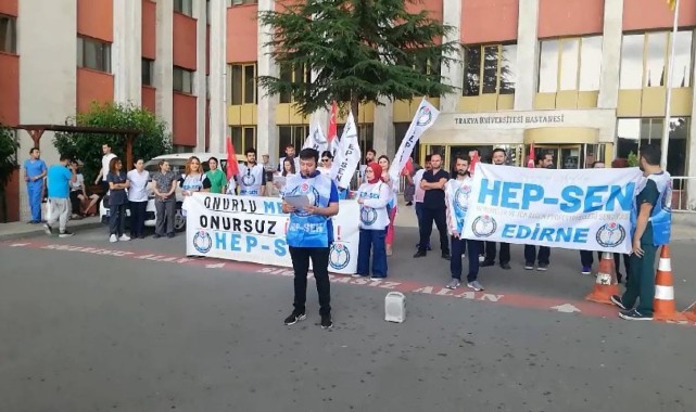 Hemşireler ve Tüm Sağlık Profesyonelleri Sendikası (HEP-SEN) Edirne İl Temsilciliği, Birleşik Kamu İş Konfederasyonu ve Genel Sağlık İş’in de katılımıyla 81 ilde 1 günlük iş bırakma eylemi yaptı. HEP-SEN Edirne İl Temsilcisi Furkan Fındık, “Tüm kamu emekçilerini, kendilerini bu maaşlara ve haklara layık gören sendikalardan istifa etmeye davet ediyoruz. Müsaade edin; kara tablonun faturasını hepimize kesen torpilcileri, rantçıları, emeğimize ihanet edenlerin tamamını temizleyelim, emeğinizin hakkı için, bizi bu yolda yalnızlığa terk etmeyin.” Dedi.