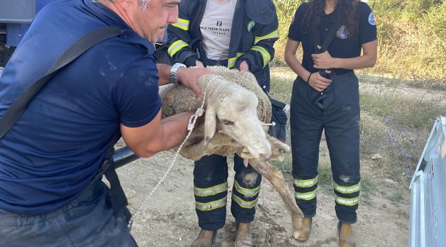 Yaklaşık 3 metrelik çukura inen itfaiye ekipleri, koyunu mahsur kaldığı yerden çıkardı.