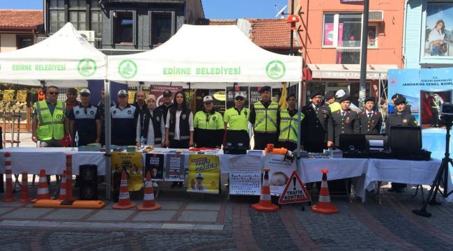 Edirne Belediyesi Ulaşım Hizmetleri Müdürlüğü, İtfaiye Müdürlüğü, Zabıta Müdürlüğü ile Jandarma Genel Komutanlığı, Edirne İl Emniyet Müdürlüğü ve AFAD’ın aralarında bulunduğu kurumların personelleri trafik güvenliği hakkında bilgilendirici afiş dağıtarak, çocuklara hediye verdiler.