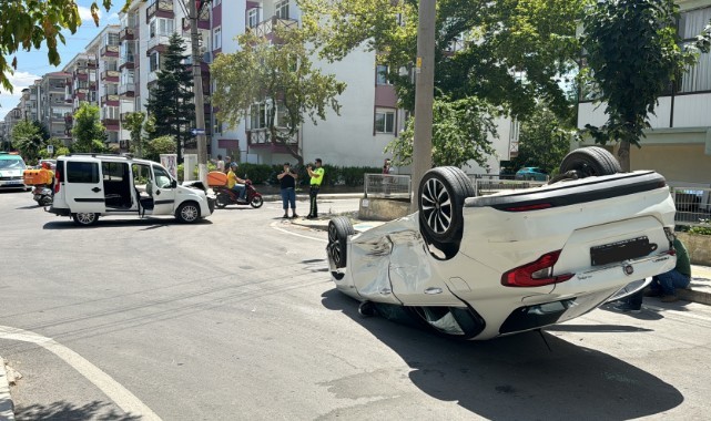 A.M.'nin kullandığı 22 AE … plakalı hafif ticari araç Koca Sinan Mahallesi'nde T.A'nın yönetimindeki 39 AG … plakalı otomobille çarpıştı.Çarpışmanın etkisiyle devrilen otomobilin sürücü kendi imkanlarıyla çıktı.Otomobil sürücüsünü olay yerine gelen oğlu teselli etti.Devrilen otomobil vatandaşların yardımıyla yolun kenarına çelidi.Kaza nedeniyle maddi hasar oluşan araçlar çekciyle kaldırıldı.(AA)