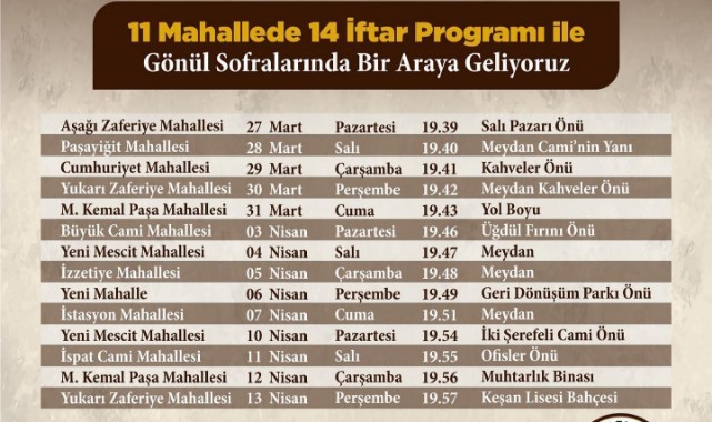 11 mahallede düzenlenecek olan 14 iftar programının takvimi şu şekilde: 27 Mart 2023 Pazartesi Aşağı Zaferiye Mahallesi saat 19.39-Salı Pazarı önü, 28 Mart 2023 Salı Paşayiğit Mahallesi saat 19.40-Meydan Camii’nin yanı, 29 Mart 2023 Çarşamba Cumhuriyet Mahallesi saat 19.41-kahvehaneler önü, 30 Mart 2023 Perşembe Yukarı Zaferiye Mahallesi saat 19.42-meydan kahveler önü, 31 Mart 2023 Cuma Mustafa Kemal Paşa Mahallesi saat 19.43-yol boyu, 3 Nisan 2023 Pazartesi Büyük Cami Mahallesi saat 19.46-Üğdül Ekmek Fırını önü, 4 Nisan 2023 Salı Yenimescit Mahallesi saat 19.47-meydan, 5 Nisan 2023 Çarşamba İzzetiye Mahallesi saat 19.48-meydan, 6 Nisan 2023 Perşembe Yeni Mahalle saat 19.49-Geri Dönüşüm Parkı önü, 7 Nisan 2023 Cuma İstasyon Mahallesi saat 19.51-meydan, 10 Nisan 2023 Pazartesi Yenimescit Mahallesi saat 19.54-İki Şerefeli Çarşı Camii önü, 11 Nisan 2023 Salı İspat Cami Mahallesi saat 19.55-Ofisler önü, 12 Nisan 2023 Çarşamba Mustafa Kemal Paşa Mahallesi saat 19.56-Muhtarlık binası ve 13 Nisan 2023 Perşembe Yukarı Zaferiye Mahallesi saat 19.57-Keşan Lisesi bahçesi. (Haber Merkezi)
