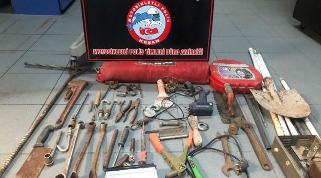 Şüphelilerin ellerindeki çuvallarda çalıntı olduğu belirlenen çadır, sanayi malzemeleri, lastik zinciri, demir parçaları ele geçirildi. Bu malzemeler sahiplerine teslim edildi.