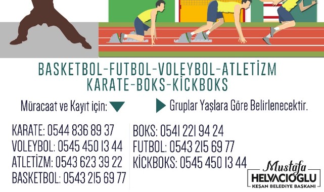 Kurslara katılmak isteyenler; karate-0544 836 89 37, voleybol-0545 450 13 44, atletizm-0543 623 3922, basketbol-0543 215 69 77, boks-0541 221 94 24, futbol-0543 215 69 77 vekickboks için 0545 450 13 44 numaralı telefonu arayarak kayıt olabilirken, semt sahaları futbol kurslarına katılmak isteyenlerin Keşan Belediyesi Atatürk Stadı Kapalı Spor Salonu’na başvuruda bulunulması gerekiyor. (Haber Merkezi)