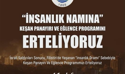 Konuyla ilgili Keşan Belediyesi tarafından yapılan açıklamada şu ifadelere yer verildi: “İsrail saldırıları sonucu, Filistin’de yaşanan “İnsanlık Dramı” sebebiyle Keşan Panayırımızı erteliyoruz ediyoruz.Filistin’de kara bulutlar kardeşlerimizin üstüne karabasan gibi çökmüş, ocaklara ateş düşmüş, yaralılar ilaçsız, haneler ekmeksiz ve susuz, analar evlatsız kalmıştır. Sözde medeni devletler suskun ve insan hakları tepkiden yoksunken, gariplerin imdadı, sivillerin feryadı ve vicdanlı yüreklerin isyanı tüm dünyayı sarmıştır.Böyle bir durumda, müziğe tutkusu, sanata sevdası herkesin malumu olan aziz Keşanlılar, aynı zamanda İstiklal Şairimiz Mehmet Akif’in şiirindeki gibi “Kanayan bir yara gördüm mü yanar ta ciğerim” diyen, “Adam aldırma da geç git, diyemem aldırırım” duyarlılığında olanlardır. Mazlumların ahını almamak, yürekleri kanatmamak, vicdanları incitmemek için Keşan Belediyesi olarak 18-22 Ekim 2023 tarihindeki Keşan Panayırımız ileri bir tarihe ertelenmiştir.”