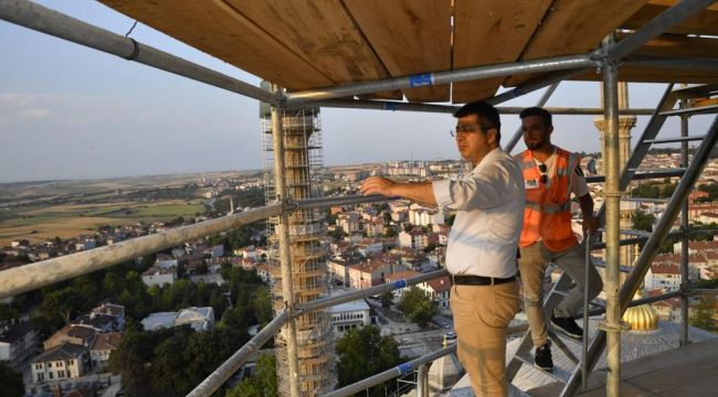 Edirne Vakıflar Bölge Müdürlüğünce yürütülen restorasyon çalışmalarını inceleyen Vali Kırbıyık, çalışmaları yerinde görmek için restorasyon çalışmaları devam eden minarelerin en uç kısmına çıktı. Kırbıyık’a eşlik eden firma yetkilileri yapılan ve yapılacak çalışmalar hakkında bilgi verdi.
