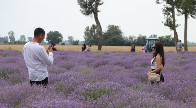 Karaağaç Mahallesi'nde ziyarete açılan mor lavanta tarlaları, başta fotoğraf meraklıları olmak üzere rengi ve kokusuyla ilgi odağı oldu, ziyaretçiler bol bol fotoğraf çekildi.