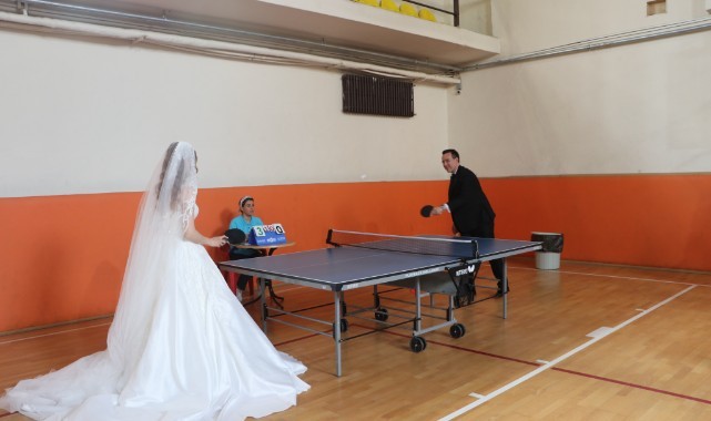 Gelinlik ve damatlığını giyen çift, 19 Mayıs Atatürk'ü Anma, Gençlik ve Spor Bayramı dolayısıyla Ekrem Demiray Spor Salonu'nda düzenlenen masa tenisi turnuvasını izledi.