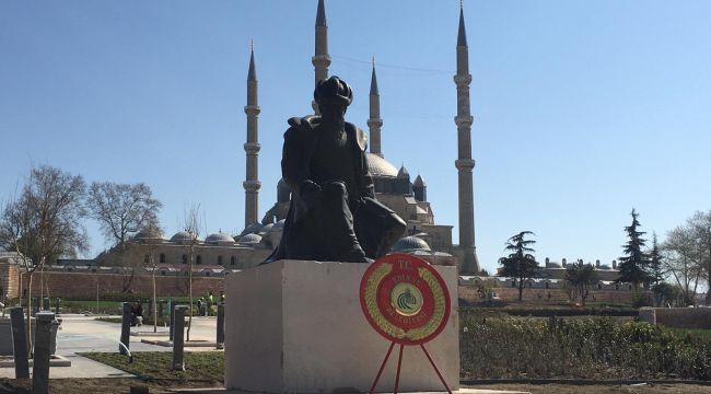 . Mimar Sinan’ın Edirne’deki heykeli 9 Nisan 1990 tarihinde heykeltıraş Ümit Öztürk tarafından Mimar Sinan’ın doğumunun 500. Yıl anısına yapılmıştı. Selimiye Camii Çevresi peyzaj çalışması kapsamında vinç yardımıyla tekrar yerine konuldu.