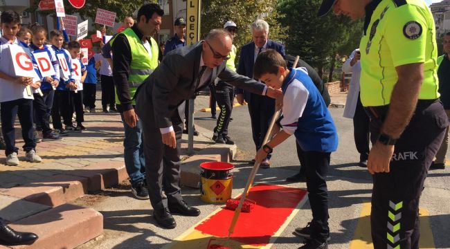 Okulun önünde bulunan yaya geçidi kırmızıya boyanırken, minik öğrenciler 'önce yaya' yazılı pankartlarla sürücüleri trafikte yayaya öncelik vermesi konusunda uyardı.