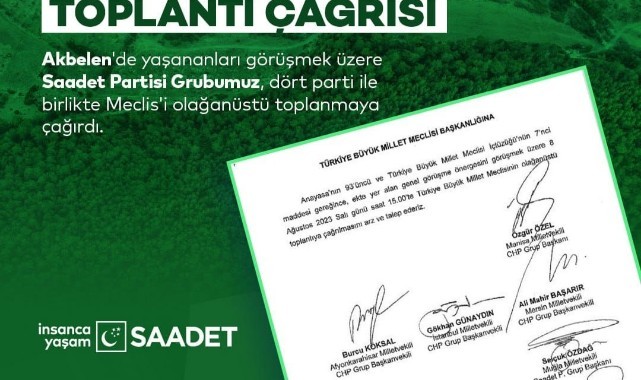 Saadet Partisi ve diğer muhalefet partilerinin Akbelen’de yaşanan ağaç katliamını görüşmek üzere TBMM Genel Kurulunu olağanüstü toplantıya çağırdığını ifade eden Saadet Partisi Edirne İl Sekreteri Faruk Yalçınkaya, “Saadet Partisi ve diğer muhalefet parti milletvekilleri Türkiye Büyük Millet Meclisini Akbelen Ormanı’nda yaşanan çevre katliamı için olağanüstü toplantıya çağırmıştır. 8 Ağustos 2023 Salı günü 15.00’te toplantı yeter sayısı bulunursa gündeme geçilecek ve Saadet Partisi ile diğer muhalefet partilerinin Akbelen’e ilişkin önerileri görüşülecek. Meclis’te grubu bulunan siyasi parti temsilcileri de öneriler üzerine görüşlerini bildirecek.” dedi. (Haber Merkezi)