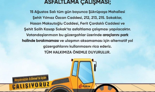 Edirne Belediyesi’nden yapılan duyuruda, 15 Ağustos Salı günü Şükrüpaşa Mahallesi’nde yapılması planlanan asfaltlama çalışması nedeniyle vatandaşların belirlenen güzergahlarda araç park etmemeleri konusunda uyarılarda bulunuldu.