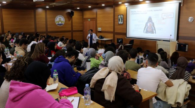 TÜ Tıp Fakültesi 5. sınıf öğrencilerine verilen derste, birçok hastalığın sebebi olan obezitenin birey ve toplum üzerindeki zararları detaylı olarak anlatılıyor.
