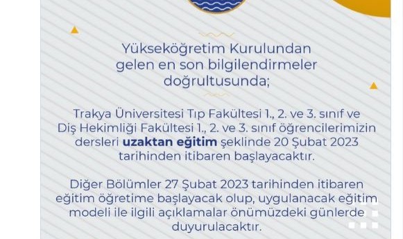 Yapılan paylaşımda; “Yükseköğretim Kurulu’ndan gelen en son bilgiler doğrultusunda; Trakya Üniversitesi Tıp Fakültesi 1., 2. ve 3. sınıf öğrencilerimizin dersleri uzaktan eğitim şeklinde 20 Şubat 2023 tarihinden itibaren başlayacaktır. Diğer bölümler 27 Şubat 2023 tarihinden itibaren eğitim öğretime başlayacak olup, uygulanacak eğitim modeli ile ilgili açıklamalar önümüzdeki günlerde duyurulacaktır.