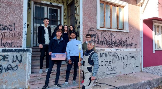 Duvar yazılarıyla kirletilen binanın duvarlarını boyayan öğrenciler, emekli öğretmen çifte güzel bir Öğretmenler Günü hediyesi verdi.