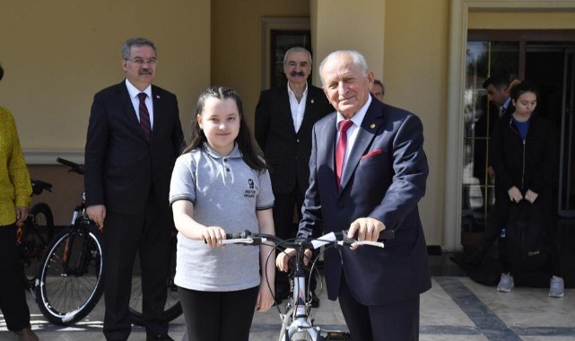 Vali Kırbıyık, dereceye giren öğrencilere ödül olarak verilen bisikletleri hediye ederek hatıra fotoğrafı çektirdi. (Haber Merkezi)
