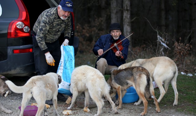 Türker, geçen yıl müzisyen arkadaşı 73 yaşındaki Mehmet Turunç ile gittiği ormanda keman eşliğinde şarkılar söyledikleri sırada köpeklerin yanlarına geldiğini fark etti. Hayvanlara yiyecek veren iki arkadaş, yaklaşık bir yıldır ormanda keman sesi ve şarkılar eşliğinde köpekleri besliyor.