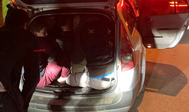 Otomobilde 14 düzensiz göçmen yakalandı. Bazıları otomobilin bagajından çıkan düzensiz göçmenler, İl Göç İdaresine götürüldü.