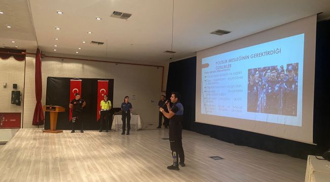 Ekipler, Polislik mesleğini öğrencilere tanıtırken, temel güvenlik tedbirleri hakkında bilgilendirme yaptı. (Haber: Ali KARAMAN)