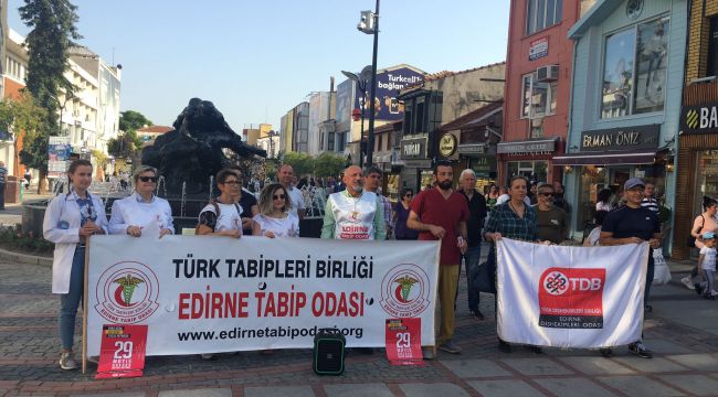 Türk Tabipler Birliği (TTB), Sağlıkta şiddetin son bulması ve hekimlerin özlük haklarının düzenlenmesi için 29 Mayıs’ta Ankara’da miting düzenleyecek. Miting ile ilgili Saraçlar Caddesi’nde Edirne Tabip Odası tarafından gerçekleşen basın açıklamasını oda başkanı Prof. Dr. Gürcan Altun okudu.