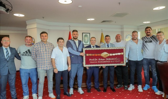 Kırkpınar başpehlivanları 662. Tarihî Kırkpınar Yağlı Güreşleri öncesinde Trakya Üniversitesine özel bir ziyaret gerçekleştirdi. Yavuz Sönmez eşliğinde Trakya Üniversitesi’nde öğrenim gören başpehlivanlardan Nedim Gürel, Semih Turgut ve Tanju Gemici, özel kontenjanlarla Türkiye’de pehlivanlara yükseköğretimin kapılarını açan Trakya Üniversitesi Rektörü Prof. Dr. Erhan Tabakoğlu’na tarihî miras Kırkpınar’a ve ömrünü ata sporuna adamış pehlivanlara verdiği desteklerden ötürü sembolik altın kemer takdim etti.
