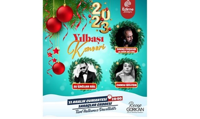 Edirne Belediyesi, her yıl olduğu gibi bu yıl da yeni yıl coşkusunu Saraçlar Caddesi’ne taşıyacak. Edirne Belediyesi tarafından düzenlenecek konserde Edirneliler, yerel sanatçılar ile 2023 yılını karşılayacak. 31 Aralık Cumartesi Günü Saat 20:00’de başlayacak konserde Dj Çağlar Bal, Cansu Milyon, Savaş Coşkun ve Grup Seyyah sahne alacak.