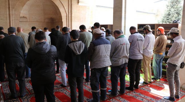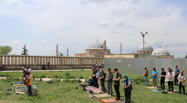 Selimiye Camisi'nde restorasyon çalışmalarının sürmesi nedeniyle cemaat ibadet için oluşturulan alanda ve bahçede namaz kıldı.