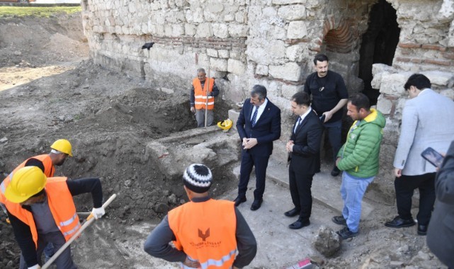 Edirne Valisi Yunus Sezer, restorasyon çalışmaları devam eden Gazi Mihal Hamamı'nda incelemede bulundu.Kapıkule Sınır Kapısı yolundaki 600 yıllık hamamın ihyası için çalışmalar sürüyor.Tarihi hamamı gezen Vali Sezer, Edirne Vakıflar Bölge Müdürü Ahmet Saraç'tan bilgi aldı.(AA)