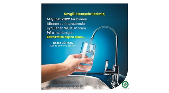 Başkan Gürkan, yaptığı paylaşımda “Sevgili hemşehrilerim; 14 Şubat 2022 tarihi itibarıyla içme suyu satış tarifesindeki %8 KDV oranı, %1 olarak uygulanmaktadır” ifadelerine yer verdi. (Haber Merkezi)