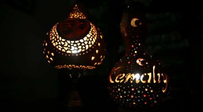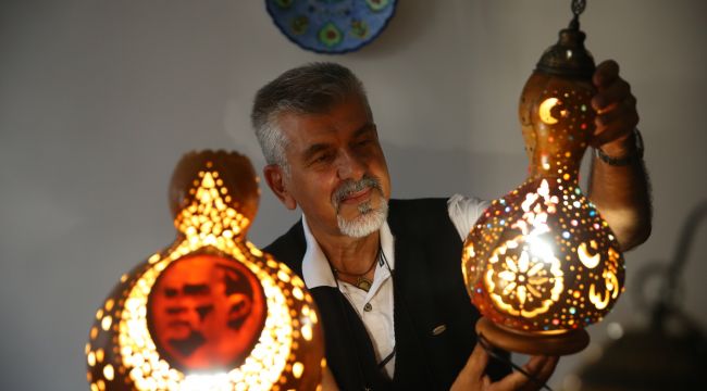 Emekli edebiyat öğretmeni 69 yaşındaki Gür, ilçe merkezindeki evinin balkonunda su kabaklarından avize ve abajur, ahşaptan da süs eşyaları yapıyor.