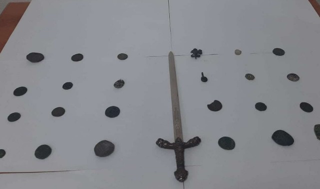 Zanlıların üst aramasında ve ellerinde bulunan poşetlerde tarihi eser niteliğinde olduğu değerlendirilen 51 obje, 24 sikke ve bir kılıç ele geçirildi.