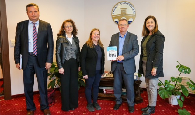 Trakya Üniversitesinin kuruluşunun 40. yıl dönümüne armağan olarak hazırlanan ve Mimarlık Fakültesinden Dr. Öğr. Üyesi Esin Benian ile Dr. Öğr. Üyesi Tülay Canıtez’in editörlüğünü üstlendiği Trakya Araştırmaları” kitabı, yayımlandı. Mimarlık Fakültesi Dekanı Prof. Dr. Hamide Burcu Özgüven, Mimarlık Fakültesi Öğretim Üyesi ve Şehit Ressam Hasan Rıza Güzel Sanatlar Meslek Yüksekokulu Müdürü Doç. Dr. Semiha Kartal ve İç Mimarlık Bölüm Başkanı Prof. Dr. Didem Baş ile birlikte Rektör Prof. Dr. Erhan Tabakoğlu’nu ziyaret ederek, Trakya Üniversitesi Yayınları’ndan çıkan kitabı takdim etti. Ziyarette Rektör Yardımcısı Prof. Dr. Metin Aydoğdu da yer aldı.