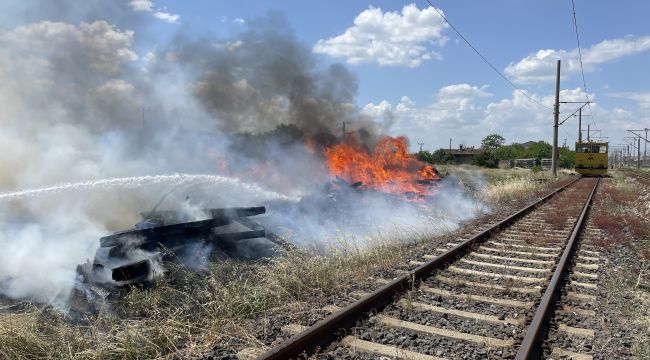 Gar yerleşkesinde istasyona yaklaşık 500 metre uzakta istiflenmiş kullanılmayan traversler henüz belirlenemeyen sebeple alev aldı.