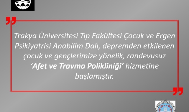 Kahramanmaraş’ta meydana gelen deprem sonrasında Trakya Üniversitesinde afet ve travma polikliniği kuruldu. Çocuk ve Ergen Ruh Sağlığı ve Hastalıkları Anabilim Dalı Başkanı Prof. Dr. Işık Görker yaptığı açıklamada “Ülkemizde büyük bir toplum kesiminin hissettiği ve yaşadığı 6 Şubat depremi sonrası ne yazık ki büyük kayıplar yaşanmış olup, yakınlarının ve çevresindeki kişilerin ölümüne tanık olanlar önemli bir travmatik süreç içindedirler. Çocukta veya erişkin bireyde bir travmatik stres reaksiyonunun oluşması için, direkt olarak veya tanık olarak kişinin yaşamını tehdit edici bir olayın potansiyel bir risk faktörü olarak oluşması gerekir. Yaşanan bir afet sonrası akut stres reaksiyon bulguları, yas reaksiyonu, travma sonrası stres bozukluğu bulguları ortaya çıkabilmektedir. Bu nedenle, Çocuk ve Ergen Ruh Sağlığı ve Hastalıkları Anabilim Dalı tarafından ‘Afet ve Travma Polikliniği’ kurulmuştur. Polikliniğimizde erken çocukluk yaş itibarı ile 23 yaşına kadar başvuruda bulunanlar randevusuz olarak muayeneye alınacaklar, başvurularına göre tek ya da aileleri ile birlikte değerlendirilecek olup, kendilerine psikososyal destek ve gerektiğinde tedavi-izlem hizmeti verilecektir.” dedi. (Haber Merkezi)