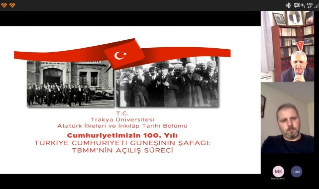 Trakya Üniversitesinde, Türkiye Büyük Millet Meclisi’nin (TBMM) açılışının 103. yılı dolayısıyla çevrim içi konferans düzenlendi. Moderatörlüğünü Atatürk İlkeleri ve İnkılap Tarihi Araştırma ve Uygulama Merkezi Müdür Yardımcısı Öğr. Gör. Dr. Tarık Sarıoğlu’nun yaptığı “Cumhuriyetimizin 100. Yılı Türkiye Cumhuriyeti Güneşinin Şafağı: TBMM’nin Açılış Süreci” konferansına Atatürk İlkeleri ve İnkılâp Tarihi Bölüm Başkanı ve Edebiyat Fakültesi Tarih Bölümü Dr. Öğr. Üyesi Bülent Atalay konuşmacı olarak katıldı. Atalay konuşmasında, Cumhuriyet’e giden yolda TBMM’nin açılış sürecini anlattı.