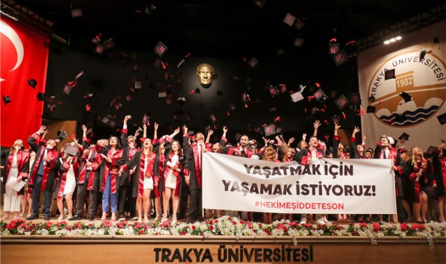 Trakya Üniversitesi Tıp Fakültesi, sağlık ordusunun yeni neferlerini 2022-2023 Akademik Yılı Mezuniyet Töreni ile uğurladı. Tıp Fakültesinden mezun olan 221 öğrenci için mezuniyet töreni düzenlendi. Saygı duruşunda bulunulması, İstiklal Marşı’nın okunması ve Trakya Üniversitesi tanıtım filminin izlenmesi ile başlayan etkinlikte Devlet Konservatuvarı öğrencileri tarafından mini bir konser verildi.Öğrencilerin eğitim-öğretim hayatlarından kesitler sunan videonun izlenmesinin ardından öğrenciler adına bir açılış konuşması gerçekleştiren fakülte birincisi Dr. Emichan Mouminoglou emek, çaba ve fedakârlıkla geçen altı yılın sonunda mezun olma sevincini yaşadıklarını belirterek “Bugün dünyanın en zor ve kutsal mesleklerinden biri olan ve hekimlik unvanı ile taçlandırılan zorlu ve yorucu eğitim sürecini başarıya tamamlamanın haklı gururunu yaşıyoruz. Bizler tıp fakültesine girdiğimiz ilk gün bir sorumluluk üstlendik. Bu sorumluluk fakülteyi bitirmekten ziyade tüm insanlığa karşı hekimliğin etik değerlerine bağlı kalarak hizmet etme ve faydalı olma isteği ile üstlendiğimiz sorumluluktur. Bizler hekimlik sanatını icra ederken çok değerli hocalarımızdan öğrendiğimiz ve bundan sonra da öğrenmeye devam edeceğimiz bilgi ve teknikleri ‘önce zarar verme, hastaya yarar sağla’ ilkeler ışığında, aklın ve bilimin rehberliğinde geliştireceğiz.” dedi ve hocaları ile ailelerine teşekkür etti.Nöroloji Ana Bilim Dalı uzmanı Dr. Oğuzhan Durgan konuşmasının başında anne ve babaların bu gururu sonuna kadar yaşamayı hak ettiklerini vurgulayarak “Buradan sadece diplomaları alıp gitmiyoruz, bir hayat okulundan mezun oluyoruz. Bugün mezun olacak arkadaşlarımızla altı yıl boyunca her sabah Trakya Üniversitesi Tıp Fakültesine, yani yuvamıza gelmek için şehrin kaldırımlarını hayallerimizle arşınladık. Bugün itibariyle bu hayaller artık vuslata erdi. Bugün bizim bayramımız. Burası bizim yuvamız. Üniversitemizle, tıp fakültemizle kurduğumuz altı yıldır büyüyen ve büyümeye devam eden gönül bağımızı hiçbir zaman kopartmayacağız.” diyerek öğrencilerin yetişmesinde büyük emekleri olan hocalara teşekkür etti.Törende, 17’si uluslararası 239 pırıl pırıl tıp doktorunu mezun edeceklerini ifade eden Tıp Fakültesi Dekanı Prof. Dr. Filiz Akata “Amacımız ‘iyi hekim’ yetiştirmektir. Misyonumuzu yerine getirebilmek için 110 profesör, 41 doçent, 55 doktor öğretim üyesi, 9 öğretim görevlisi ve 604 araştırma görevlisi doktor olmak üzere toplam 819 öğretim elemanı ile eğitim, araştırma ve hizmet faaliyetini yürütmekteyiz. Genç hekimlerimizi özveri ve gayretle yetiştiren öğretim üyelerimizi tebrik eder, teşekkürlerimi arz ederim. Sizleri çağdaş, evrensel bilgilerle donatılmış genç doktorlar olarak topluma kazandıran değerli öğretim üyelerimiz, uzmanlık eğitiminiz için de sizleri kucaklamaya hazırlar. Başarılarınız hepimizi gururlandıracak, bundan emin olunuz.” dedi.Mezunların artık birer hekim olduğunu söyleyen Dekan Prof. Dr. Filiz Akata “Altı yıllık uzun bir eğitim sürecinin sonunda saygın ve ulvi bir meslek olan tıp doktoru oldunuz. İyi hekim olmanın en önemli koşulu iyi bir insan olmaktır. Hekimlik mesleği vicdani yükümlülüğü ve sorumluluğu en yüksek olan meslektir. İnsan hayatına dokunuyoruz. Hastalarınıza karşı şefkatli olunuz. Sizin yakınlarınıza hasta olduklarında nasıl davranılması gerektiğini düşünüyorsanız, sizde hastalarınıza o şekilde davranınız.” ifadelerini kullandı.Konuşmasında mezun öğrencilerin velilerine de seslenen Dekan Akata “Bugün sizlerin gurur duyacağı bir gün. Altı yıl önce Beyaz Önlük Töreni ile bizlere emanet ettiğiniz gençlerimiz bugün mezun oluyor. Geleceğimizi emanet edeceğimiz son derece nitelikli eğitime sahip çocuklarımızın yetiştirilmesinde gösterdiğiniz maddi ve manevi katkılarınızı, evlatlarınızın ülkemiz için yapacakları hizmetle karşılıksız bırakmayacaklarına inancım tamdır.” Dedi.Tıp Fakültesi Dekanı Prof. Dr. Filiz Akata konuşmasını mezun öğrencilere şu cümlelerle seslenerek sonlandırdı: “Sağlık ordusunun yeni neferleri ve genç meslektaşlarım, kapımız sizlere her zaman açık. Biz bir aileyiz, bunu unutmayınız. Bilimsel düşünceye ve geniş bir dünya görüşüne sahip, insan haklarına saygılı hekimler olarak topluma hizmet vermeniz dileğiyle, bundan sonraki meslek ve özel yaşamınızda sağlıklı, başarılı ve mutlu olmanızı temenni ederim.”Rektör Vekili Prof. Ahmet Hamdi Zafer, öğrencilere seslenerek başladığı konuşmasında “Trakya Üniversitesi, sağlık alanında köklü geleneği ve büyük bir geçmişi olan bir üniversitedir. Siz değerli öğrencilerimiz de bu geleneğin içerisinde alanlarında uzman hocalarımızın emek ve gayretleri, tam donanımlı eğitim imkânları ile geleceğe en iyi şekilde hazırlandınız. Mezuniyet Öncesi Tıp Eğitimi Programı ile birlikte uluslararası akredite eğitim programlarının olduğu fakültemizde almış olduğunuz eğitim ve göstermiş olduğunuz emekleriniz sonucunda birer hekim olarak bugün mezun oluyor ve aynı heyecanla hayata atılıyorsunuz. Sizlerle bizim için gurur verici bir gelişmeyi daha paylaşmak istiyorum. Bu yıl ilk kez 40 üniversiteden 129 program, diplomalarında, Türkiye Yeterlilik Çerçevesi (TYÇ) Logosu kullanmaya hak kazandı. Tıp lisans programımız da bu kapsamda, yurt içinde ve yurt dışında eğitim ve istihdam piyasasında aranan yüksek niteliklerin ve kalitenin varlığının işareti olan TYÇ Logosu’nu kullanma hakkı kazanan programlardan biri oldu. Bu logo, Üniversitemizin eğitim kalitesini ve mezunlarımızın ulusal ve uluslararası alanda tanınırlığını daha da güçlü