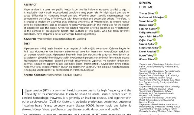 İleri yaşlarla beraber artan yaygın bir halk sağlığı sorunu olan hipertansiyonla çalışma hayatının etkisi ile daha sık karşılaşılmaktadır. İş yerlerinde hipertansiyona yönelik farkındalığı arttırıcı faaliyetlerde bulunmak, düzenli periyodik muayenelerin yapılmasını sağlamak ve gereken önlemlerin almak için Türk Kardiyoloji Derneği Hipertansiyon Çalışma Grubu’nun hayata geçirdiği Hipertansiyon ve İş Yeri Sağlığı Uzlaşı Raporu yayımlandı. Birçok farklı disiplinin katkı sağladığı rapora Trakya Üniversitesi Tıp Fakültesi Kardiyoloji Ana Bilim Dalı Başkanı ve Türk Kardiyoloji Derneği Hipertansiyon Yönetim Kurulu Üyesi Prof. Dr. Servet Altay ile Kardiyoloji Ana Bilim Dalı’ndan Doç. Dr. Muhammet Gürdoğan, Dr. Öğr. Üyesi Çağlar Kaya ve Adli Tıp Ana Bilim Dalı’ndan Prof. Dr. Gürcan Altun katkı sağladı.(Haber Merkezi)