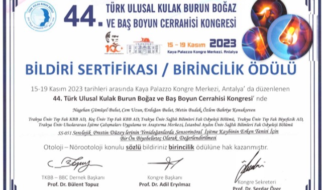 Her yıl düzenli olarak yapılan ve bu yıl da 44’üncüsü düzenlenen Ulusal Kulak Burun Boğaz Kongresi’nde “Serolojik Prestin Düzeylerinin Yenidoğanlarda Sensorinöral İşitme Kaybının Erken Tanısı İçin Bir Ön Biyobelirteç Olarak Değerlendirilmesi” başlıklı çalışma ile Trakya Üniversitesi Tıp Fakültesi Kulak Burun ve Boğaz Hastalıkları Anabilim Dalından Uzm. Odyolog Nagehan Gümüşel Bulut, Trakya Üniversitesi (TÜ) Uluslararası İşitme Çalışmaları ve Uygulama Merkezi Kurucu Müdürü ve Koç Üniversitesi Kulak Burun ve Boğaz Hastalıkları Anabilim Dalı Başkanı Prof. Dr. Cem Uzun, İstanbul Aydın Üniversitesi Odyoloji Bölüm Başkanı Prof. Dr. B. Özlem Konukseven, TÜ Sağlık Bilimleri Fakültesi Odyoloji Bölümü Öğretim Üyesi Doç. Dr. Erdoğan Bulut ve Tıp Fakültesi Biyofizik Bölümü Öğretim Üyesi Doç. Dr. Metin Budak, Otoloji ve Nörotoloji alanında sözel bildiri 1. lik ödülü almaya hak kazandılar.