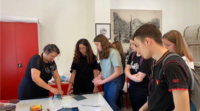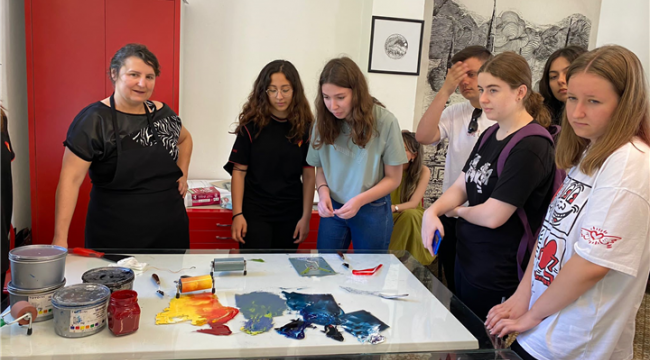 İngilizce öğretmeni Banu Bakırcı ve Resim-İş öğretmeni Semra Özcan’ın eşlik ettiği 9, 10 ve 11. sınıf öğrencileri, Prof. Melihat Tüzün’den özgün baskıresim teknikleri hakkında bilgiler edindi. Ardından öğrenciler, kendi monobaskı çalışmalarını yaptı.