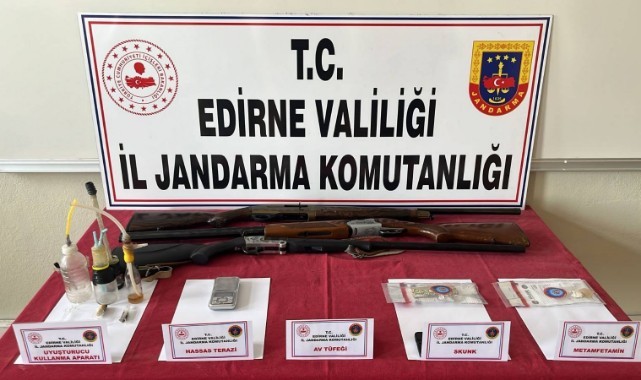 Bu kapsamda Edirne İl J.K.lığı KOM Şube Müdürlüğünce alınan istihbari bilgilerin değerlendirilmesi sonucu, Uyuşturucu Madde Arama Köpek Unsuru ile yapılan operasyon faaliyetinde 1 araç ve 1 evde yapılan aramada neticesinde 1,39 gr metamfetamin maddesi, 0,50 gr skunk maddesi, 8 adet uyuşturucu kullanma aparatı ve 1 adet uyuşturucu içme kağıdı 1 adet hassas terazi, 3 adet ruhsatsız av tüfeği ele geçirildi.