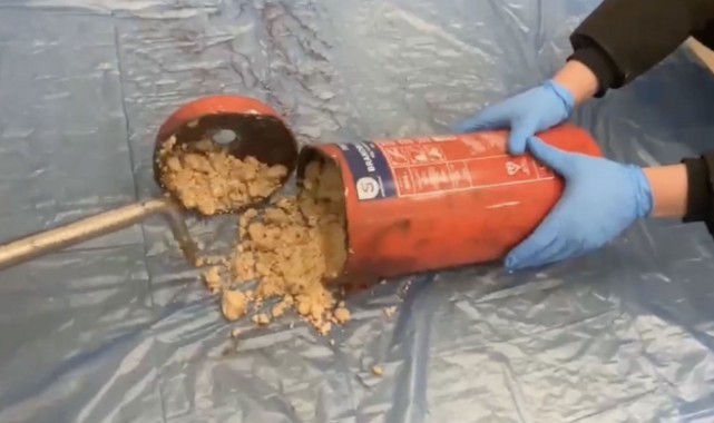 Kapıkule Sınır Kapısı'nda yangın söndürme tüplerine gizlenmiş 18 kilo 120 gram uyuşturucu yapımında kullanılan madde ele geçirildi.Edirne Emniyet Müdürlüğü Narkotik Suçlarla Mücadele Şube Müdürlüğü ekipleri, Kapıkule Sınır Kapısı'nda şüphelendikleri bir tırda dedektör köpekleri Yappa ve Kongar ile arama gerçekleştirdi.Aramada tırın 2 adet yangın söndürme tüpü içerisine gizlenmiş 18 kilo 120 gram sentetik uyuşturucu hap yapımında kullanılan hammadde ele geçirildi.Gözaltına alınan sürücü T.B, emniyetteki ifadesinin ardından adliyeye sevk edildi. Şüpheli çıkarıldığı mahkemece tutuklandı.(AA)