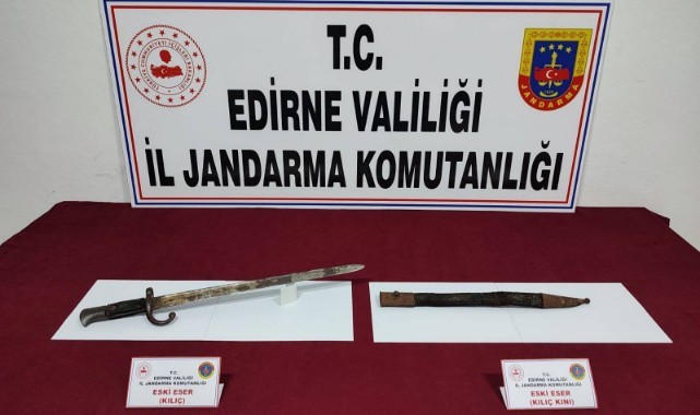 Edirne İl Jandarma Komutanlığı KOM Şube Müdürlüğünce R.T. İsimli şahsın satışa çıkarmayı planladığı tarihi eser niteliğinde olan Osmanlı dönemine ait 150 yıllık kılıç ve kılıca ait kın ile birlikte yakalandı.