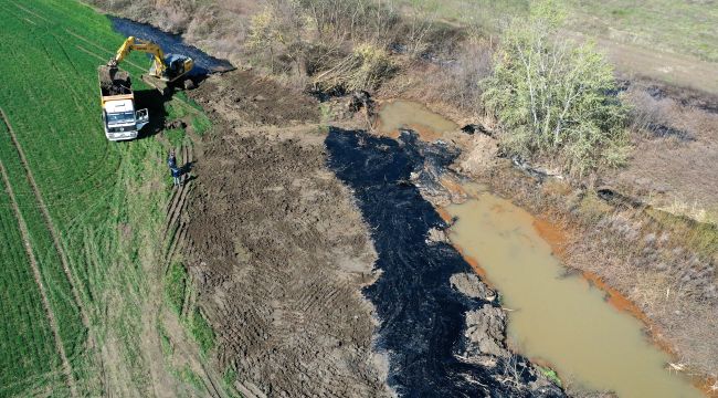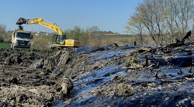 Hasanağa köyü yakınlarındaki bir şantiyede, 6 Nisan Çarşamba günü asfalt yapımında kullanılan ziftin depolandığı havuzun duvarının yıkılması sonucu çevredeki tarım arazilerinin bir bölümü ziftle kaplanmıştı. (AA)